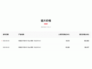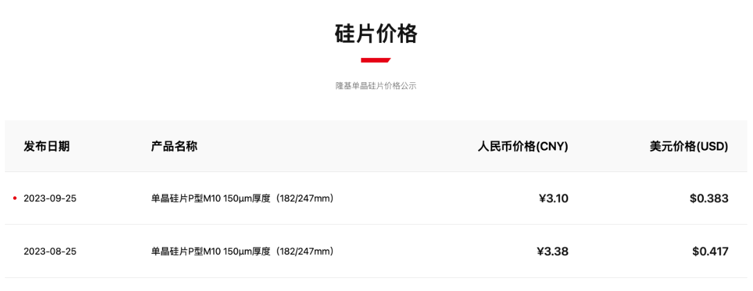 9月25日,隆基綠能更新了182mm單晶硅片的最新售價(jià),從3.38元/片下調(diào)至3.10元/片,跌幅8.28%。