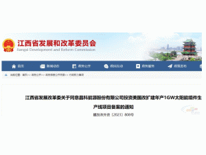 11月21日,江西發(fā)改委發(fā)布同意晶科能源投資美國改擴(kuò)建年1GW組件生產(chǎn)線項(xiàng)目備案的通知。