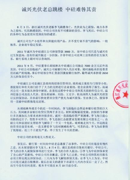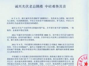 最近,浙江光伏老板跳樓一事被吵得沸沸揚揚,有說法是浙江誠興光伏科技有限公司(以下簡稱“誠興公司”)資金鏈緊張,也有說是老板李飛患有抑郁癥,還有傳聞李飛給溫州信泰集團老板胡福林擔保貸款,因?qū)Ψ竭不上錢,壓力太大而跳樓。今日中午,誠興公司員工周先生向Solarzoom光伏太陽能網(wǎng)記者爆料說李飛的死與浙江中硅新能源股份有限公司(以下簡稱“中硅公司”)脫不開干系。