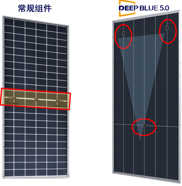 順應(yīng)新的電路設(shè)計(jì),晶澳DeepBlue 5.0更改善了背玻孔位,通過(guò)創(chuàng)新采用三點(diǎn)分散結(jié)構(gòu),改善了傳統(tǒng)三點(diǎn)集中結(jié)構(gòu)的應(yīng)力風(fēng)險(xiǎn),同步強(qiáng)化了組件的抗載荷能力。在背玻應(yīng)力對(duì)比中,采用背?孜弧叭欠稚⒉季帧钡腄eepBlue 5.0較常規(guī)組件均有明顯優(yōu)勢(shì)。