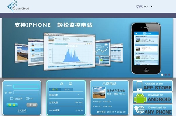 據(jù)介紹,Solar Cloud的使用可以通過Web網(wǎng)頁、Android系統(tǒng)以及蘋果的IOS系統(tǒng)來實現(xiàn)。項目主要由數(shù)據(jù)中心網(wǎng)關(guān)、平臺網(wǎng)站、手機客戶端、PMU多個子項目組成。Solar Cloud實現(xiàn)了用戶對逆變器的遠程監(jiān)控,用戶可以通過iPhone、iPad、Android等移動設備實施監(jiān)控光伏電站的工作狀態(tài),超越地域限制,隨時隨地查看逆變器的發(fā)電信息及事件。同時可以通過Email、手機軟件等方式定期提醒用戶發(fā)電信息及事件。圖形化展示發(fā)電情況;手機客戶端提供用戶便捷化的查看電站的發(fā)電量,事件等信息。