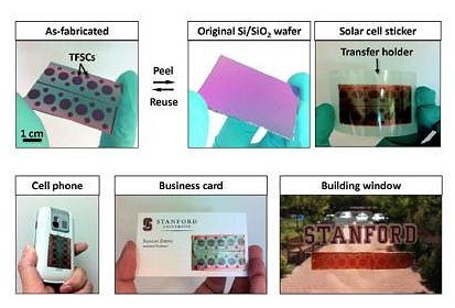 據(jù)國(guó)外媒體報(bào)道,斯坦福大學(xué)科學(xué)家發(fā)明了即剝即貼太陽(yáng)能電池板,這種新型太陽(yáng)能電池板可以像創(chuàng)可貼一樣被剝離下來粘附在任何表面上,它能提供和普通太陽(yáng)能電池板一樣大小的電能,重要的是,該太陽(yáng)能電池板不需要任何裝配,大大拓寬了太陽(yáng)能技術(shù)的潛在應(yīng)用范圍。