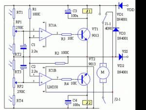 電路原理圖如圖1所示,雙運(yùn)放LM358與R1、R2構(gòu)成兩個(gè)電壓比較器,參考電壓為VDD(+12V)的1/2。光敏電阻RT1、RT2與電位器RP1和光敏電阻RT3、RT4與電位器RP2分別構(gòu)成光敏傳感電路,該電路的特殊之處在于能根據(jù)環(huán)境光線的強(qiáng)弱進(jìn)行自動(dòng)補(bǔ)償。如圖2所示,將RT1和RT3安裝在垂直遮陽(yáng)板的一側(cè),RT4和RT2安裝在另一側(cè)。當(dāng)RT1、RT2、RT3和RT4同時(shí)受環(huán)境自然光線作用時(shí),RP1和RP2的中心點(diǎn)電壓不變。如果只有RT1、RT3受太陽(yáng)光照射,RT1的內(nèi)阻減小,LM358的③腳電位升高,①腳輸出高電平,三極管VT1飽和導(dǎo)通,繼電器K1導(dǎo)通,其轉(zhuǎn)換觸點(diǎn)3與觸點(diǎn)1閉合。同時(shí)RT3內(nèi)阻減小,LM358的⑤腳電位下降,K2不動(dòng)作,其轉(zhuǎn)換觸點(diǎn)3與靜觸點(diǎn)2閉合,電機(jī)M正轉(zhuǎn);同理,如果只有RT2、RT4受太陽(yáng)光照射,繼電器K2導(dǎo)通,K1斷開,電機(jī)M反轉(zhuǎn)。當(dāng)轉(zhuǎn)到垂直遮陽(yáng)板兩側(cè)的光照度相同時(shí),繼由器K1、K2都導(dǎo)通,電機(jī)M才停轉(zhuǎn)。