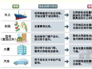 目前在“水上”、“農田”、“住宅(屋頂以外)”、“大廈”及“汽車”領域,積極利用太陽能電池的行動日益活躍(圖1)。有些領域已經開始進行實證實驗,并已有了具體的設置事例。為了全面普及太陽能電池,各領域正積極推進旨在解決課題的相關舉措。