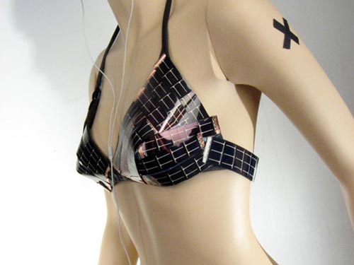雖然這是一款太陽能比基尼,但卻具有一定的諷刺性,比基尼的衣料太少,只能充當(dāng)小型充電器。然而這款比基尼卻是集美觀實(shí)用于一體,其微妙的平衡性即能對隨身攜帶的手機(jī)和照相充電,也是一件性感實(shí)用的泳衣。