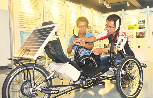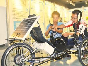 一輛由在校大學生設計制造的光伏“躺車”近日在常州亮相,該車依靠車尾部位安裝的光伏板收集太陽能,速度可達每小時20公里。圖為該車設計者、常州機電職業(yè)技術(shù)學院學生凌奔(右)、馬鈺鑫在調(diào)試車輛。