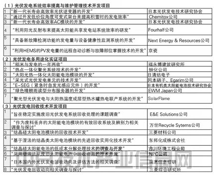三大項(xiàng)目分別為(1)光伏發(fā)電系統(tǒng)效率提高與維護(hù)管理技術(shù)開發(fā)項(xiàng)目、(2)光伏發(fā)電多用途化實(shí)證項(xiàng)目、(3)光伏發(fā)電再利用開發(fā)項(xiàng)目”。