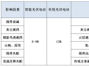 光伏電站中,線路損耗、逆變系統(tǒng)損耗、交流并網(wǎng)損耗相對(duì)固定,難以顯著改善,光伏陣列損失是主要的改善空間。特別是組件衰減程度不一致的影響。據(jù)業(yè)界專家研究結(jié)果,出廠時(shí),各組件已有不同程度的衰減。電站運(yùn)行5年后,組件衰減程度不一致性將達(dá)到5%以上,嚴(yán)重的甚至達(dá)到8-10%。智能光伏電站解決方案通過多路MPPT有效規(guī)避了這類損失。下表是智能光伏電站與傳統(tǒng)方案在光伏陣列損失維度的比較: