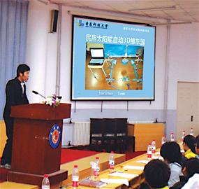天天“宅”實(shí)驗(yàn)室練就“全能” 李瑞說,毛刷的材料只是整個結(jié)構(gòu)的一環(huán),整個擦車裝置上,不僅有木質(zhì)結(jié)構(gòu),還有各種機(jī)械設(shè)計(jì)。為了完成這些組件,李瑞他們?nèi)砍闪恕八{(lán)領(lǐng)”,給木板鉆孔、打磨螺絲、焊接結(jié)構(gòu)幾乎把所有的工種都干了一遍,遇到夏天最熱的時候,幾個小伙子干脆赤膊上陣。經(jīng)過連續(xù)2年的努力,這一太陽能擦車裝置終于出爐。根據(jù)前期測算,接上一塊太陽能電池板,僅僅20分鐘左右,擦車裝置就能讓一輛臟車煥發(fā)新顏。在今年8月份舉行的山東省大學(xué)生機(jī)電產(chǎn)品創(chuàng)新設(shè)計(jì)大賽上,這一作品取得了優(yōu)秀獎。