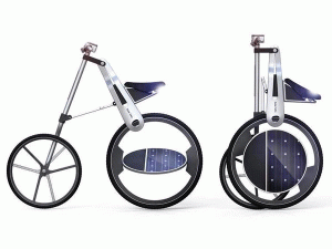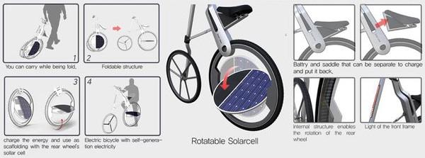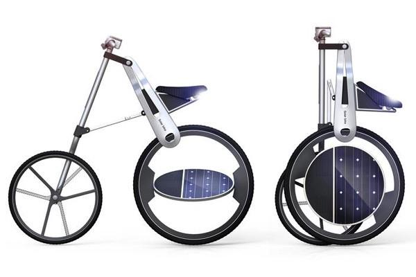 跟普通自行車相比,太陽(yáng)能自行車的外形稍有不同,首先整體框架更加簡(jiǎn)潔,其次它的后輪盤上配備的是一塊太陽(yáng)能吸收板。板子可以翻轉(zhuǎn)至水平位置,這樣的話騎在上面的人可以把腳蹬在上面。一路上自行車將吸取太陽(yáng)能供電,減少了沉重的電瓶設(shè)計(jì)。另外,太陽(yáng)能自行車還易于折疊,折好后即可用手提著,亦可放進(jìn)車后備箱,方便外出攜帶。這時(shí)候太陽(yáng)能板就翻成了與車輪圈在一個(gè)平面的位置,把車平放在地上更可以全方位吸收能量。