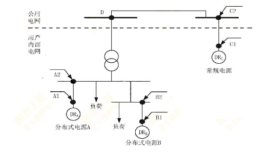 1、并網(wǎng)點(diǎn),對(duì)于有升壓站的分布式電源,并網(wǎng)點(diǎn)為分布式電源升壓站高壓側(cè)母線或節(jié)點(diǎn);對(duì)于無(wú)升壓站的分布式電源,并網(wǎng)點(diǎn)為分布式電源的輸出匯總點(diǎn)。如下圖所示A1、B1點(diǎn)分別為分布式電源A、B的并網(wǎng)點(diǎn)。C1點(diǎn)為常規(guī)電源C的并網(wǎng)點(diǎn)。