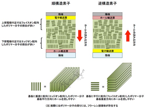 用大型同步輻射設(shè)施“SPring-8”分析此次的有機(jī)薄膜太陽(yáng)能電池發(fā)電層的構(gòu)造時(shí)發(fā)現(xiàn),在元件的上部電極和下部電極附近,半導(dǎo)體聚合物的分子配向不同,電荷的易流動(dòng)性在元件上下方向也不同。