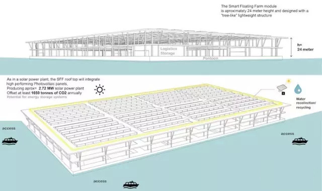 這一設計彌補了傳統(tǒng)農業(yè)的缺陷,用浮動的太陽能模塊,利用了傳統(tǒng)農業(yè)難以利用的水域,保證糧食生產的長期安全性和生產彈性。