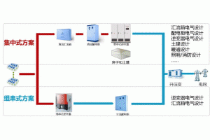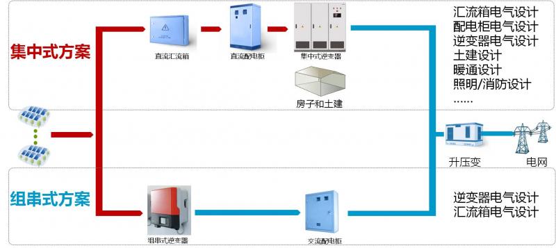 1 組串式和集中式電站結(jié)構(gòu)對(duì)比 集中式光伏電站解決方案主要包括組件、直流匯流箱、直流配電柜、逆變器及其配套的逆變器房或集裝箱體、箱式升壓變等。