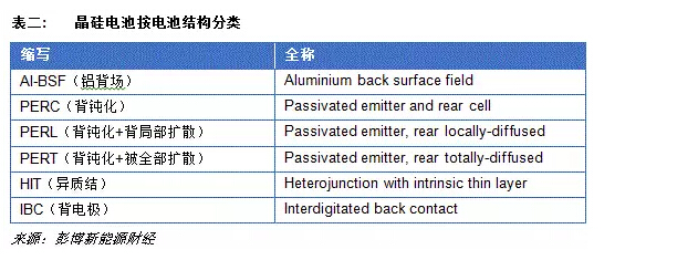· 背電極:?jiǎn)尉В╪型)。例如SunPower的產(chǎn)品。 按照效率由高到低:背電極,異質(zhì)結(jié),PERT,PERL,單晶PERC,單晶鋁背場(chǎng),多晶PERC,多晶鋁背場(chǎng)。