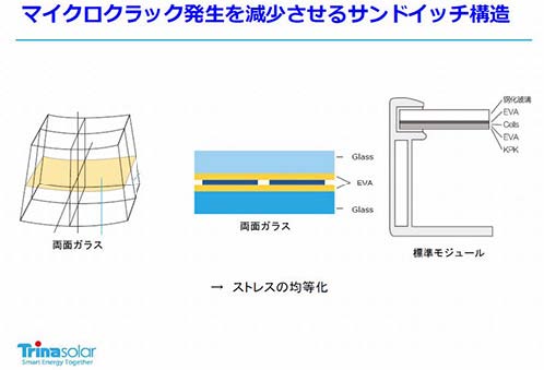 本文繼續(xù)介紹中國(guó)大型太陽(yáng)能電池板廠商的日本法人天合光能日本公司(東京都港區(qū)),就利用雙面玻璃太陽(yáng)能電池板提高可靠性技術(shù)的發(fā)布會(huì)內(nèi)容。以往采用樹脂背板的太陽(yáng)能電池板存在的可靠性課題,可通過用兩枚玻璃夾住電池板的密封構(gòu)造來解決。