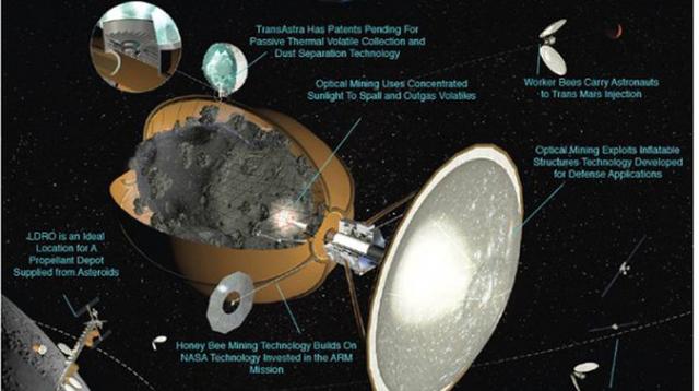該方法的特點是可收集小行星上的水資源,將小行星裝入一個巨大的充氣裝置中,通過直接加熱太陽能提高充氣裝置內(nèi)部的溫度。同時集中使用太陽能加熱可在小行星表面鉆洞,破壞小行星的堅實結(jié)構(gòu),有利于后續(xù)開采小行星。當(dāng)飛船到底目的地后,小行星開采的前處理工作也基本完成了。首席研究員Joel Sercel估計一次收集120噸的液態(tài)水,同時還有其他蒸發(fā)出來的物質(zhì)。