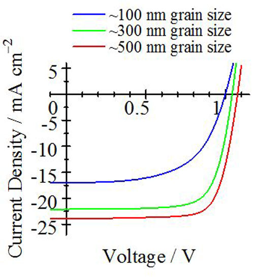 不同粒徑(膜厚)的鈣鈦礦太陽能電池的電流-電壓曲線(出處:JST)