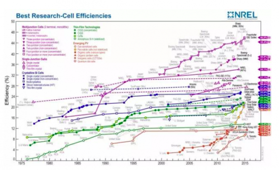 圖1. 歷年來各類型太陽能電池效率記錄(NREL編纂)