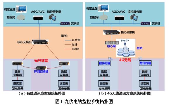 有線方案中,每個發(fā)電單元內(nèi)部以光纖形式輸出并組成環(huán)網(wǎng),通過核心交換機將數(shù)據(jù)上傳到監(jiān)控中心,而4G無線通訊方案中電站內(nèi)需要建一座無線基站,每個光伏單元通過無線與基站進行通信,基站內(nèi)核心網(wǎng)設(shè)備再將無線信號轉(zhuǎn)成有線信號上傳至監(jiān)控中心。