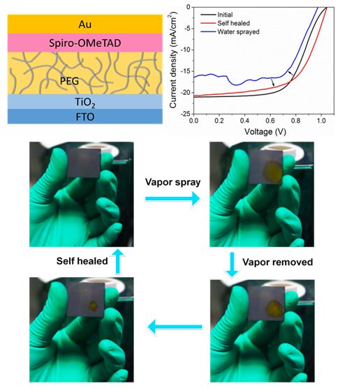 聚合物骨架鈣鈦礦太陽(yáng)能電池結(jié)構(gòu)示意圖;電池光伏性能的自修復(fù)I-V曲線;鈣鈦礦薄膜在被水汽破壞后一分鐘內(nèi)的自修復(fù)展示照片,薄膜回復(fù)到初始狀態(tài)。