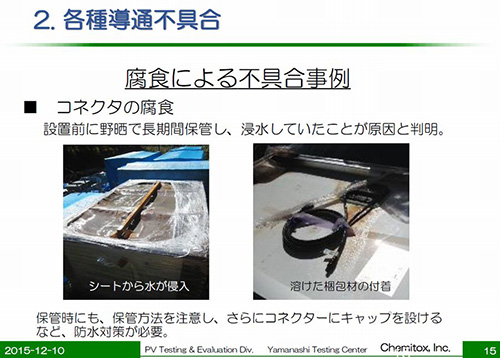 原因在于施工時太陽能電池板的保管不當,使包裝材料內(nèi)浸水(出處:Chemitox)