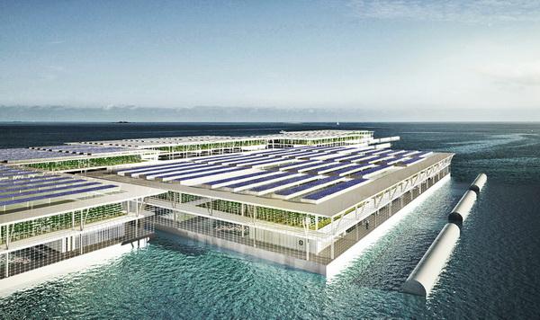 農(nóng)業(yè)顯然也消耗了大量土地資源,所以浮動(dòng)農(nóng)場(chǎng)也不失為一個(gè)好主意。西班牙巴塞羅那的設(shè)計(jì)師提出了這個(gè)智能浮動(dòng)農(nóng)場(chǎng)的概念,采用模塊化設(shè)計(jì),可以非常方便地組合在一起,同時(shí)結(jié)合太陽(yáng)能,可提供水培、水產(chǎn)養(yǎng)殖,每年可產(chǎn)出8152噸蔬菜和1703噸魚(yú)類水產(chǎn)。