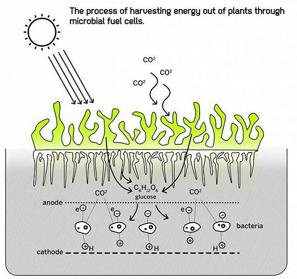 在光合作用過程中,植物利用光能把周邊環(huán)境中的二氧化碳和水轉(zhuǎn)化為有機化合物!埃ㄌμ\)釋放的有機化合物進入含有共生菌的土壤,細菌為生存對有機化合物進行分解,這一過程就產(chǎn)生了含有電子的副產(chǎn)品!盡itrofanova說,“只需為這些微生物產(chǎn)生的電子提供一個電極,這些電子就能被收集且發(fā)電!