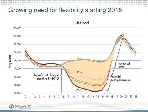 因分散型光伏發(fā)電系統(tǒng)的大量導(dǎo)入,出現(xiàn)了白天發(fā)電量超過(guò)用電量,但在傍晚太陽(yáng)能發(fā)電停止時(shí),電力需求卻急劇上升的現(xiàn)象。不久的將來(lái)填補(bǔ)這種巨大的供需缺口會(huì)變得困難——加利福尼亞州幾年前就開(kāi)始有了這種擔(dān)憂。