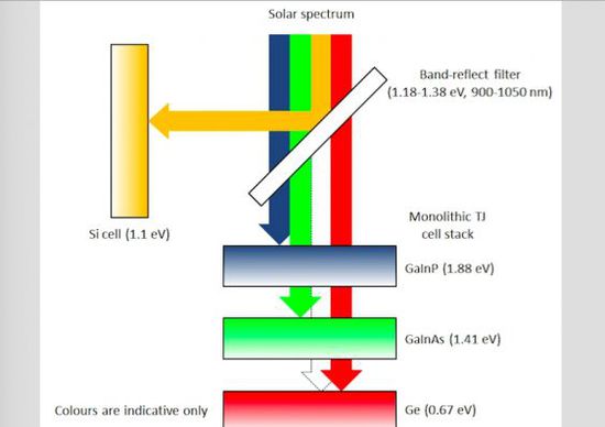 這種太陽能電池有三層,各自對應(yīng)不同的光波,能夠最有效地利用光能,而剩下的光能會傳遞到下一層、最終紅外光波會被篩出反彈到硅光電池那邊。
