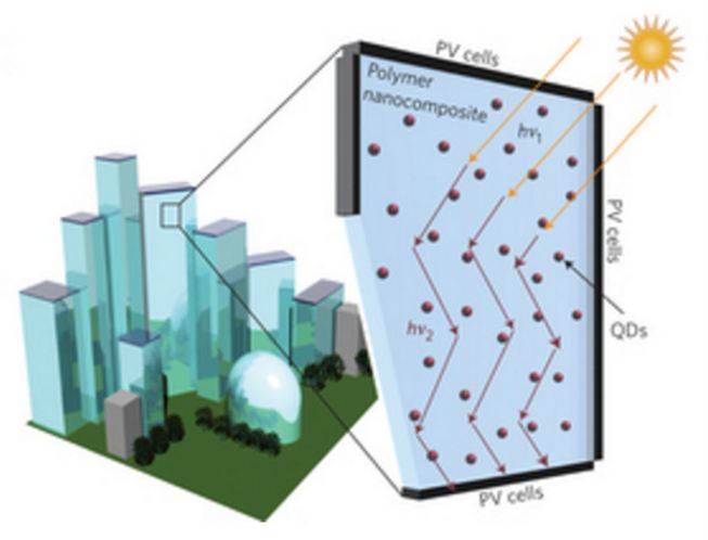 科學(xué)家將硅納米顆粒植入到 LSC 里,當(dāng)太陽光線照射在窗戶表面,LSC 能吸收太陽光線中的有效光線,并將光線反射到硅納米粒子,從而吸收太陽能。