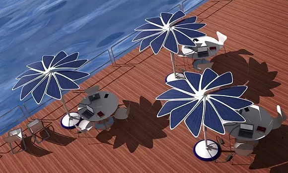 這款遮陽傘傘頂由輕便的太陽能電池板組成