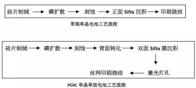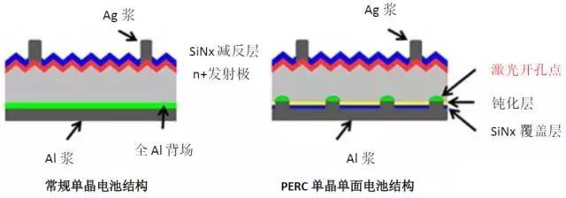 和常規(guī)單晶電池工藝相比,PERC單晶電池主要增加了背面鈍化、背面SiNx膜沉積和激光打孔三道工藝。其中激光打孔工藝是利用一定脈沖寬度的激光在去除部分覆蓋在電池背面的鈍化層和SiNx覆蓋層,以使絲網(wǎng)印刷的鋁漿可以與電池背面的硅片形成有效接觸,從而使光生電流可以通過Al層導出。因Al漿無法穿透SiNx層,其余未被激光去除的鈍化層被覆蓋在其上方的SiNx覆蓋層保護,發(fā)揮降低表面復合速率,提升效率的作用。