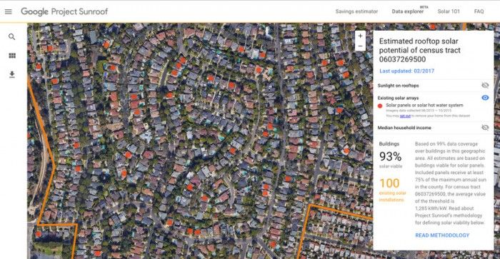 太陽能屋頂項目始于2015年,通過谷歌地球數(shù)據(jù)向用戶展示太陽能面板實際收獲的太陽能以及安裝位置。另外,它還能計算出太陽能面板給每戶人家節(jié)省的生活成本并提供當?shù)靥柲苊姘骞⿷痰男畔ⅰ?/div>