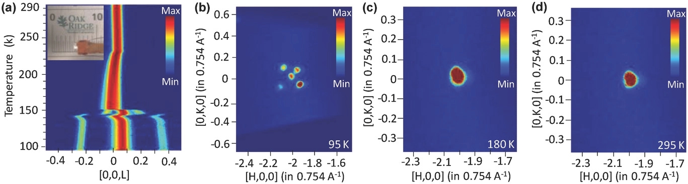 楊斌教授和合作者們運用美國橡樹嶺國家實驗室的大科學裝置“散裂中子源”高分辨單晶中子衍射,解析了雜化鈣鈦礦材料CH3NH3PbBr3在不同溫度下的結(jié)構,觀察到有機組分CH3NH3+隨溫度升高從有序到無序的轉(zhuǎn)變過程,揭示了分子取向及排列變化可以誘導CH3NH3PbBr3鈣鈦礦的結(jié)構相變和反常光致發(fā)光效應。該工作表明,有機組分的取向和翻轉(zhuǎn)可以顯著影響雜化鈣鈦礦材料的微觀結(jié)構和宏觀光電性質(zhì)。這項研究成果將為今后設計和開發(fā)新型高性能鈣鈦礦型光伏材料,從而提高鈣鈦礦太陽能電池的能量轉(zhuǎn)換效率和長期穩(wěn)定性提供科學依據(jù)。