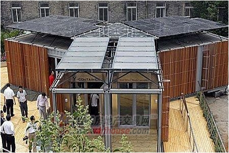 6月16日,由同濟大學(xué)學(xué)生設(shè)計建造的“陽光集裝房”正式亮相上海。這座造價25萬美元的“陽光集裝房”建筑面積90平方米,由6個集裝箱每2個一組拼裝成Y字型空間,室內(nèi)家具電器一應(yīng)俱全,全部由太陽能供給。太陽屋還集成了多項建筑節(jié)能技術(shù):對安裝在屋頂?shù)墓夥l(fā)電系統(tǒng),結(jié)合實際情況進行優(yōu)化;天花板、墻壁、地面都裝有高性能的新型真空保溫板;將太陽能熱水集熱與空調(diào)廢熱回收,集成為一體,提高了太陽能的總體利用效率;利用導(dǎo)光管將自然光引入用于室內(nèi)照明,屋頂還配置有雨水收集和中水回用系統(tǒng),最大限度地利用自然資源。此外,居室內(nèi)環(huán)境監(jiān)測、能源管理、設(shè)備管理等全部實現(xiàn)了數(shù)字化、信息化、可視化,住宅的產(chǎn)能、能耗、居住環(huán)境等數(shù)據(jù)信息能實時直觀展示,還可利用3G手機等移動終端進行遠程監(jiān)管。