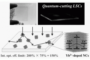 吳凱豐研究團(tuán)隊(duì)提出,基于量子裁剪效應(yīng)的LSCs內(nèi)部光學(xué)效率可重新定義一個(gè)新的理論極限為150%。研究團(tuán)隊(duì)合成了稀土金屬鐿摻雜的CsPbCl3納米晶,發(fā)現(xiàn)其熒光效率高達(dá)164%,表現(xiàn)出典型的量子裁剪特征。通過(guò)CsPbCl3納米晶吸收一個(gè)藍(lán)光光子產(chǎn)生激子,再將能量轉(zhuǎn)移給兩個(gè)鐿原子的激發(fā)態(tài),從而發(fā)出兩個(gè)近紅外光子。動(dòng)力學(xué)測(cè)試表明高效的量子裁剪過(guò)程發(fā)生于皮秒級(jí)別。采用此類納米晶制備出原型的量子裁剪LSCs,實(shí)現(xiàn)了約120%的器件內(nèi)部光學(xué)效率?深A(yù)期的是,通過(guò)進(jìn)一步優(yōu)化器件和提高太陽(yáng)光吸收能力,可在大面積LSCs中突破10%的外部光學(xué)效率。