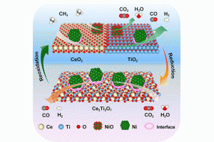 此外,甲烷部分氧化的轉(zhuǎn)化率高達近100%。該催化劑經(jīng)過50個氧化還原循環(huán)后,仍能夠保持較高的二氧化碳和水裂解速率和甲烷轉(zhuǎn)化率。詳細的表征和DFT理論計算研究表明,單質(zhì)鎳和CeO2-TiO2復(fù)合氧化物存在協(xié)同效應(yīng):單質(zhì)鎳和鎳/氧化物界面為該循環(huán)反應(yīng)的活性中心,可有效活化惰性氣體分子二氧化碳、水和甲烷,促進循環(huán)過程中CeO2-TiO2復(fù)合氧化物到Ce2Ti2O7燒綠石的相變,以及鈰的深度還原;循環(huán)過程中CeO2-TiO2復(fù)合氧化物晶格氧的嵌入與脫除為二氧化碳和水裂解,以及甲烷部分氧化提供了熱力學(xué)驅(qū)動力,從而實現(xiàn)該催化劑的高活性和高穩(wěn)定性。該工作為設(shè)計高效催化體系用于太陽能熱化學(xué)儲能技術(shù)提供了重要的理論依據(jù)和全新的策略。