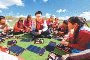 7月4日,國網(wǎng)江蘇省電力有限公司將900套便捷式光伏臺燈贈送給青,敹嗫h民族寄宿制學(xué)校師生。圖為青年志愿者向同學(xué)們講解光伏臺燈的使用方法。 梁德斌攝(人民視覺)