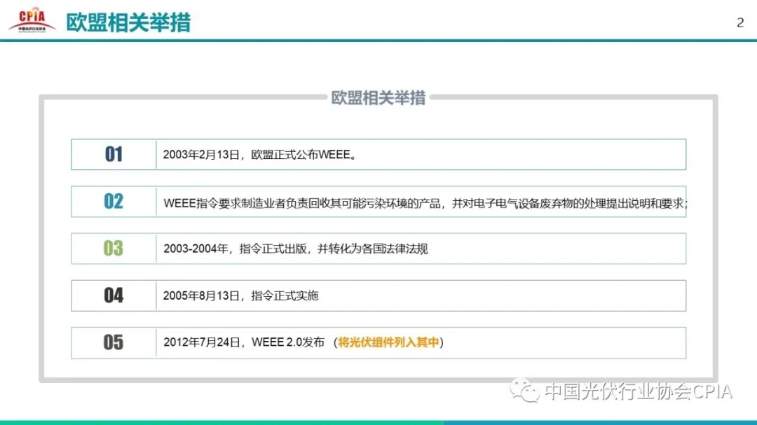近日,在中國光伏行業(yè)協(xié)會主辦的“廢棄光伏組件線上研討會”上,中國光伏行業(yè)協(xié)會江華主任研究員作“廢棄光伏組件處理政策研究思路”的報告。