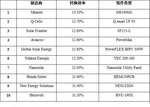 太陽能光伏行業(yè)發(fā)展至今最為人詬病的一項就是發(fā)電成本較高,而光伏組件轉(zhuǎn)換效率是其中的關(guān)鍵因素。提高光伏組件的轉(zhuǎn)化效率是普及太陽能發(fā)電應(yīng)用的重中之重。幾年前,著名薄膜電池板制造企業(yè)Nanosolar提出了太陽能產(chǎn)業(yè)的“三次技術(shù)革新浪潮”概念。將以太陽能級硅和硅片為原材料的晶體硅電池作為第一次技術(shù)革新浪潮;將薄膜太陽能電池列為第二次技術(shù)革新浪潮;最新一個是以柔性電池為代表。早在2000年,全世界太陽能光伏行業(yè)就定下了2020年的行業(yè)目標:(1)把單晶硅電池的轉(zhuǎn)換效率從16.5%提高到22%;(2)把多晶硅電池的轉(zhuǎn)換效率從14.5%提高到20%;(3)a-Si/uc-Si、CIGS和CdTe薄膜電池的轉(zhuǎn)換效率提高到10%-15%。值得慶幸的是,近幾年太陽能產(chǎn)業(yè)在這幾方面都取得了不小的進步。下面為您盤點一下到目前為止全球十大轉(zhuǎn)換效率最高的CI(G)S光伏組件。