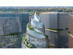 在接手這個項目時,NBBJ 即承接了“優(yōu)先考慮健康工作的環(huán)境”的設(shè)計理念。盤繞而上的螺旋式塔樓受 DNA 雙螺旋結(jié)構(gòu)啟發(fā),也將這座大廈外部不同的元素統(tǒng)一了起來。