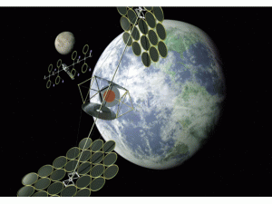 美國(guó)國(guó)家航空航天局的一位藝術(shù)家在1999年繪制的軌道太陽(yáng)能發(fā)電場(chǎng)。像許多其他太空太陽(yáng)能設(shè)計(jì)一樣,該設(shè)施需要許多連接部件,這意味著發(fā)射成本將非常高昂