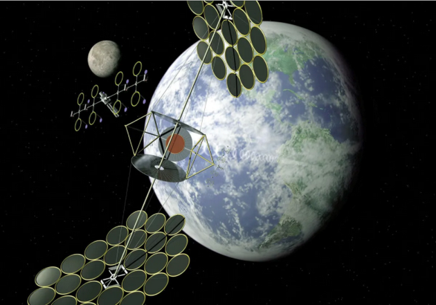 高地球軌道是建造太陽(yáng)能發(fā)電場(chǎng)的好地方,因?yàn)檫@里太陽(yáng)永遠(yuǎn)不會(huì)落下,永遠(yuǎn)不會(huì)有遮蔽的云層。然而,為了產(chǎn)生大量的電力,以往的大多數(shù)設(shè)計(jì)都是不切實(shí)際的,不僅規(guī)模龐大,而且成本高昂,是當(dāng)前人類社會(huì)負(fù)擔(dān)不起的。在工程師們的描繪中,有巨大的桁架結(jié)構(gòu),通常長(zhǎng)達(dá)數(shù)公里;光伏板或鏡子安裝在桁架上,吸收或集中陽(yáng)光,將光能轉(zhuǎn)化成直流電,然后通過(guò)激光或微波光束傳輸?shù)降孛。建造這樣一個(gè)裝置可能需要數(shù)百次火箭發(fā)射。在很多人看來(lái),這注定是一項(xiàng)因?yàn)橐?guī)模太大而無(wú)法成功的技術(shù)。
