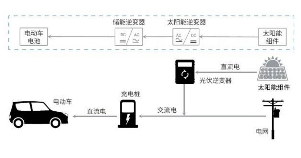 在此系統(tǒng)中,太陽能首先用于支持家庭負(fù)載。多余的電力通過DC/DC電路給電動(dòng)汽車充電。充電可以根據(jù)時(shí)間段使用策略或負(fù)載優(yōu)先級(jí)進(jìn)行控制。逆變器和電動(dòng)汽車充電樁之間需要通信,理想的通信方式為無線通信或PLC通信。