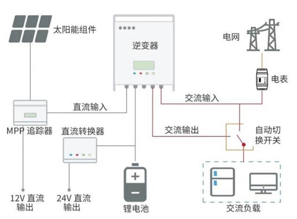 交流電在電力高壓傳輸時(shí)比直流電更方便,實(shí)際應(yīng)用場景也更為多樣。但在部分場景中,直流電直接給直流負(fù)載供電的應(yīng)用,可以使電路設(shè)計(jì)更簡單,更高效。在新能源電力系統(tǒng)中,一些直流負(fù)載應(yīng)用,比如太陽能路燈、直流空調(diào)、5G通信基站等,在光伏+儲(chǔ)能系統(tǒng)中,可以通過光伏或電池直接進(jìn)行直流供電。直流供電系統(tǒng)連接示意圖備
