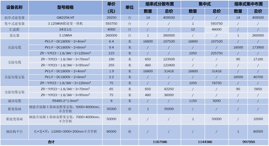 在地面電站中,現(xiàn)階段主流機(jī)型位225kW組串式逆變器和3125kW集中式逆變器,組串式逆變器的單價(jià)略高于集中式逆變器,但是采用組串式逆變器集中化布置的優(yōu)化方案,可以有效減少交流電纜的使用量,減少的交流電纜量完全可以抵消組串式和集中式逆變器的差價(jià),見下表成本分析。
