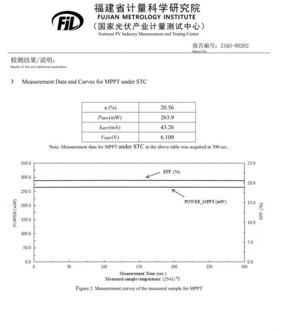近日,在麥耀華教授、吳紹航副研究員和高彥艷博士生等人的共同努力下,團(tuán)隊(duì)在大面積有機(jī)/無(wú)機(jī)雜化鈣鈦礦光伏組件的研究上取得突破,經(jīng)過(guò)國(guó)家光伏產(chǎn)業(yè)計(jì)量測(cè)試中心的測(cè)試認(rèn)證,組件光電轉(zhuǎn)換效率達(dá)到21.37%(孔徑面積效率,12.84cm2),最大功率點(diǎn)穩(wěn)定輸出轉(zhuǎn)換效率達(dá)20.56%,均為當(dāng)前鈣鈦礦光伏組件的世界最高轉(zhuǎn)換效率。