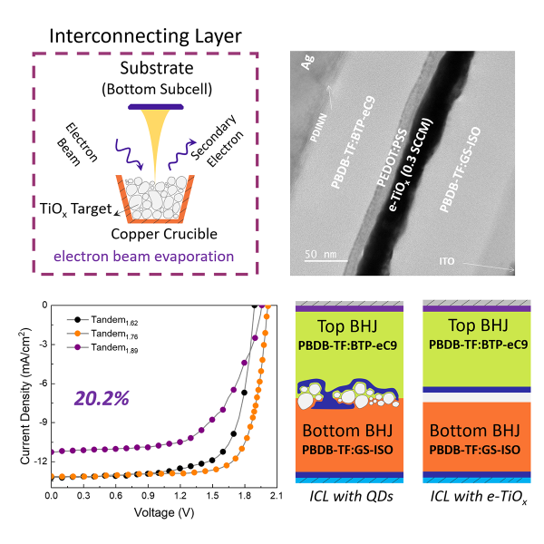 近期,中國(guó)科學(xué)院化學(xué)研究所高分子物理與化學(xué)實(shí)驗(yàn)室研究員侯劍輝課題組發(fā)現(xiàn),在電子束蒸發(fā)二氧化鈦的過程中,金紅石相的二氧化鈦可轉(zhuǎn)化為非晶態(tài)薄膜。該薄膜不僅均勻致密,還具有較好的耐酸性。因此,聚(3,4-乙烯二氧噻吩):聚苯乙烯磺酸(PEDOT:PSS)可通過溶液法在其表面形成光滑、致密的薄膜。進(jìn)一步,課題組通過精確控制補(bǔ)氧速率,有效調(diào)節(jié)了沉積物的化學(xué)組成、電子能級(jí)、相對(duì)介電常數(shù)和摻雜密度。在最佳條件下,基于e-TiO1.76//PEDOT:PSS隧道結(jié)的疊層有機(jī)太陽(yáng)能電池的光伏效率超過了20%。