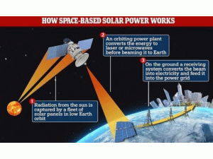 空間太陽(yáng)能發(fā)電系統(tǒng)需要一個(gè)太陽(yáng)能衛(wèi)星,即一臺(tái)裝有太陽(yáng)能電池板的巨型航天器。這些電池板可以發(fā)電,然后通過高頻無線電波將能量無線傳輸?shù)降厍。一種名為硅整流二極管天線的地面天線將把無線電波轉(zhuǎn)換成電力,再將其傳送至電網(wǎng)。